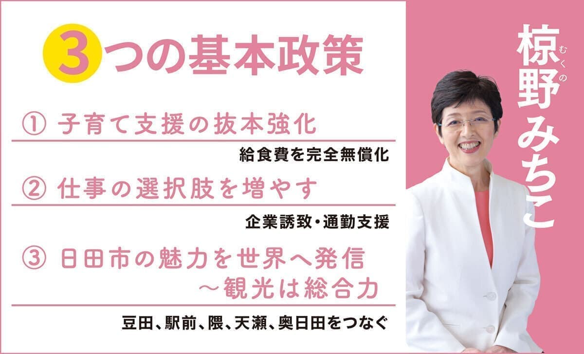 この4年間で、日田市のいろいろな地域の、いろいろな産業、いろいろな暮らしをしている、たくさんの市民の方を知ることができました。私は、日田市のことをよく知っているそういう市民の方々と一緒に、日田市を「安心と未来への希望がみえるまち」、「森と川と伝統文化を活かしてイノベーションを続ける世界に開かれたまち」にしていきたい。